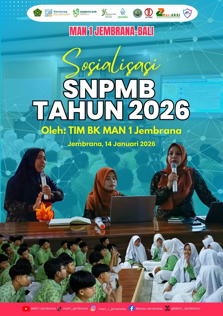 MAN 1 Jembrana menyelenggarakan kegiatan Sosialisasi Seleksi Nasional Penerimaan Mahasiswa Baru (SNPMB) Tahun 2026 pada Rabu, 14 Januari 2026 bertempat di Laboratorium Terpadu Lantai 3. Kegiatan ini diikuti oleh seluruh siswa kelas XII dengan pendampingan langsung dari Guru Bimbingan dan Konseling (BK), serta Bapak dan Ibu Wali Kelas XII sebagai bentuk dukungan dan pelayanan akademik kepada peserta didik.