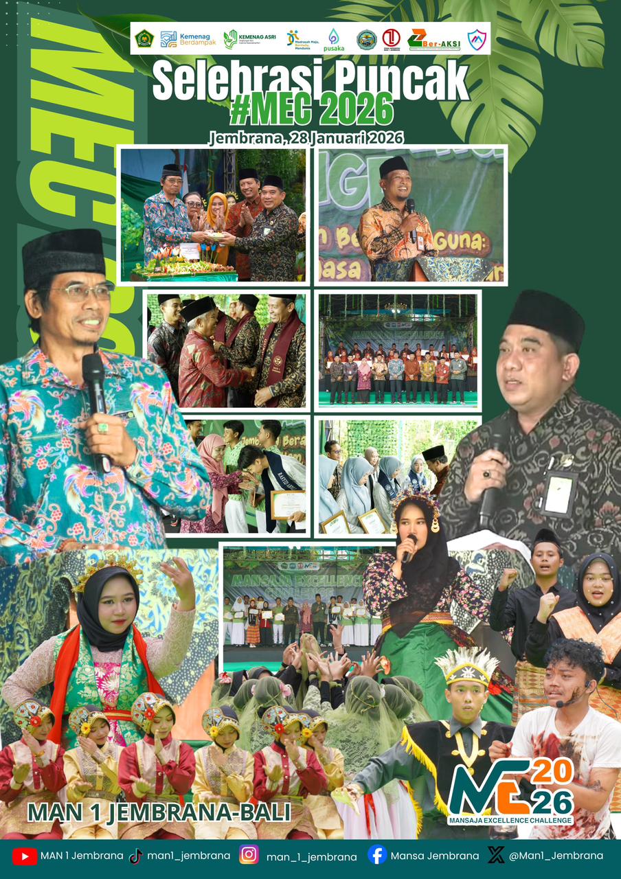 Rabu (28/01/2026) Negara, Jembrana. Madrasah Aliyah Negeri 1 Jembrana menggelar Mansaja Excellence Challenge (MEC) pada pagi hari di Kota Negara, Kabupaten Jembrana, Bali. Kegiatan ini mengusung tema “MAN 1 Jembrana Beraksi dan Berdayaguna: Menguatkan Iman, Alam, dan Masa Depan Lestari”, sebagai wujud komitmen madrasah dalam menghadirkan pendidikan yang memadukan kecerdasan spiritual, intelektual, sosial, serta kepedulian terhadap lingkungan hidup.