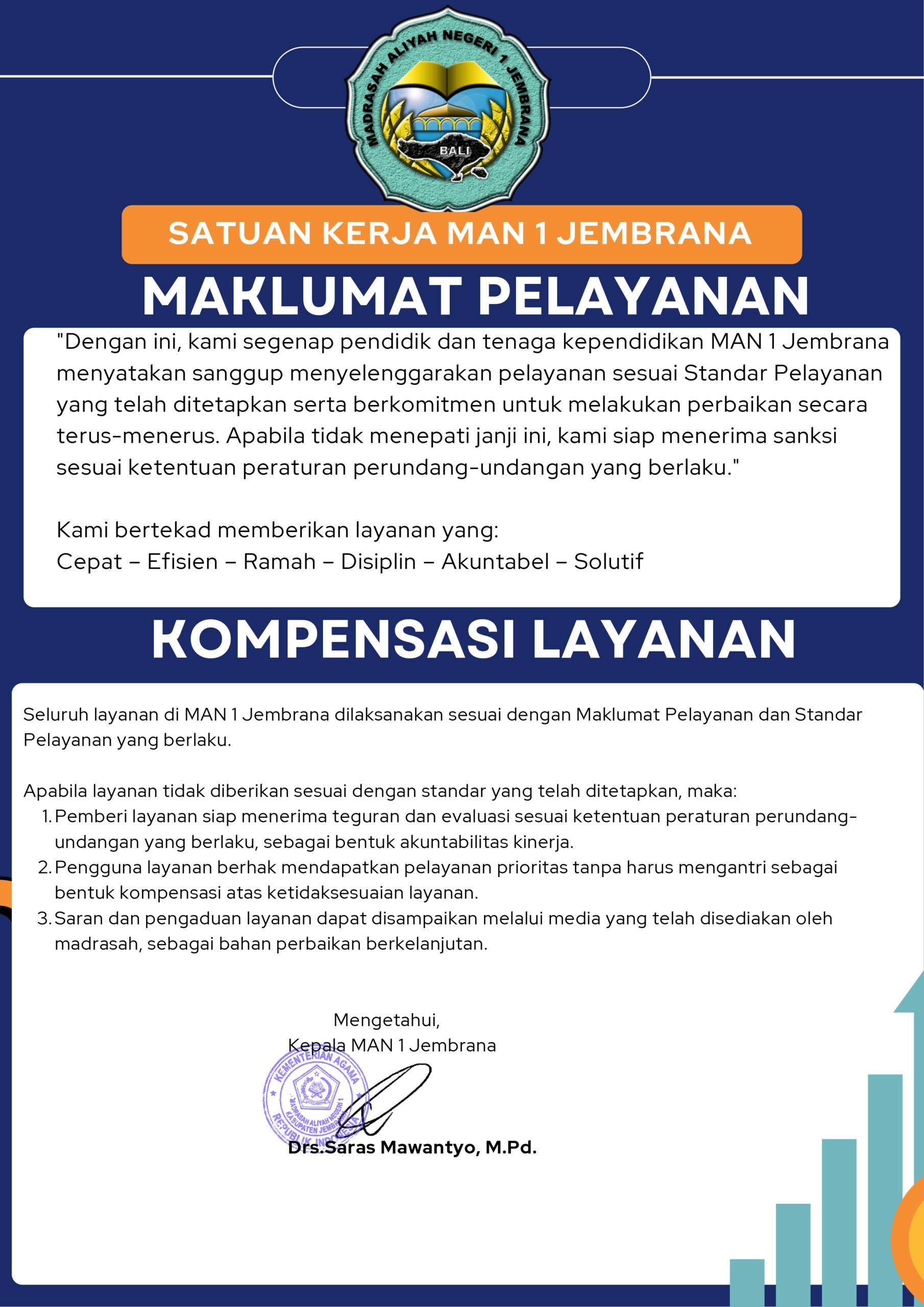PPID MAN 1 Jembrana berkomitmen untuk memberikan pelayanan informasi yang cepat, tepat, sederhana, dan berbiaya ringan, serta terus meningkatkan kualitas layanan demi memenuhi hak masyarakat atas informasi publik dan mendukung terwujudnya madrasah yang informatif dan terpercaya.